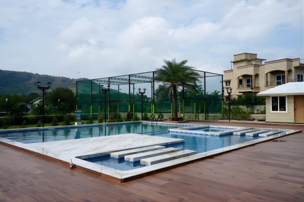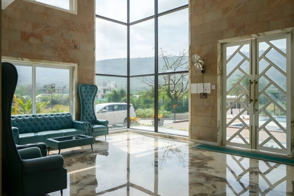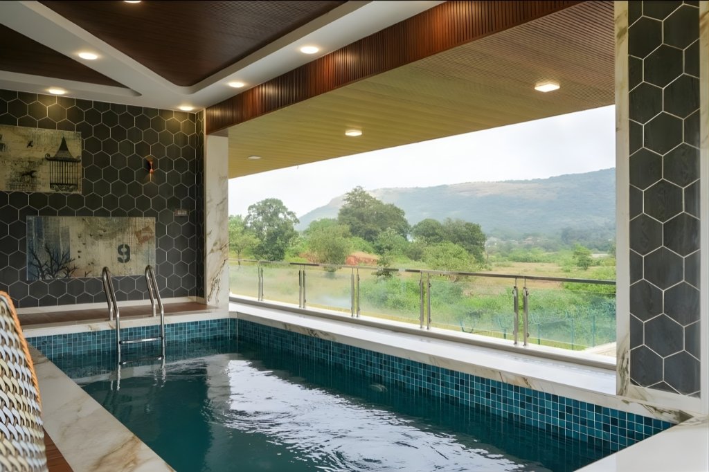One of the biggest highlights of the 8bhk VILLA in Lonavala with Private pool and cricket turf is its indoor infinity swimming pool along with outdoor poolside seating. Guests can relax beside the pool, enjoy late-night conversations, or unwind after a long day of travel.